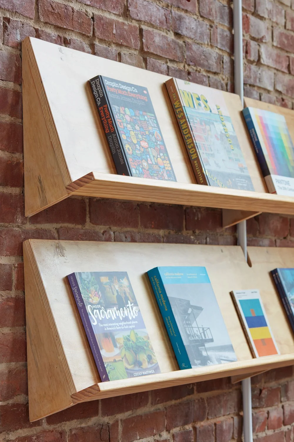 Wooden shelves with books displayed against a brick wall